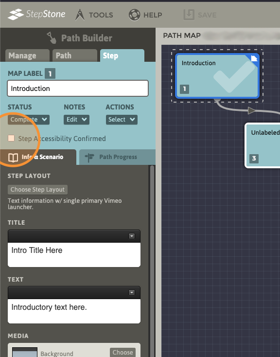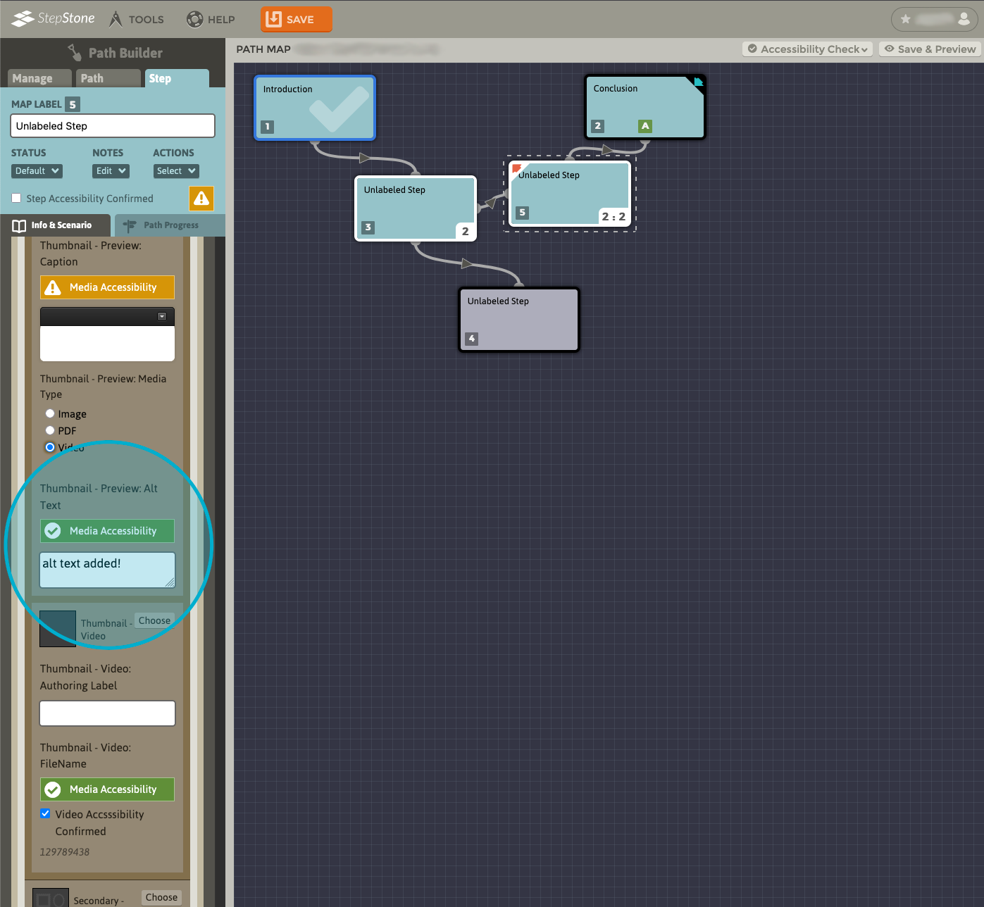 Please note that Step Accessibility Confirmed is an authoring-area-only status, and does not communicate nor confirm any indication to a browser/screenreader/etc. that the Path is indeed accessible.