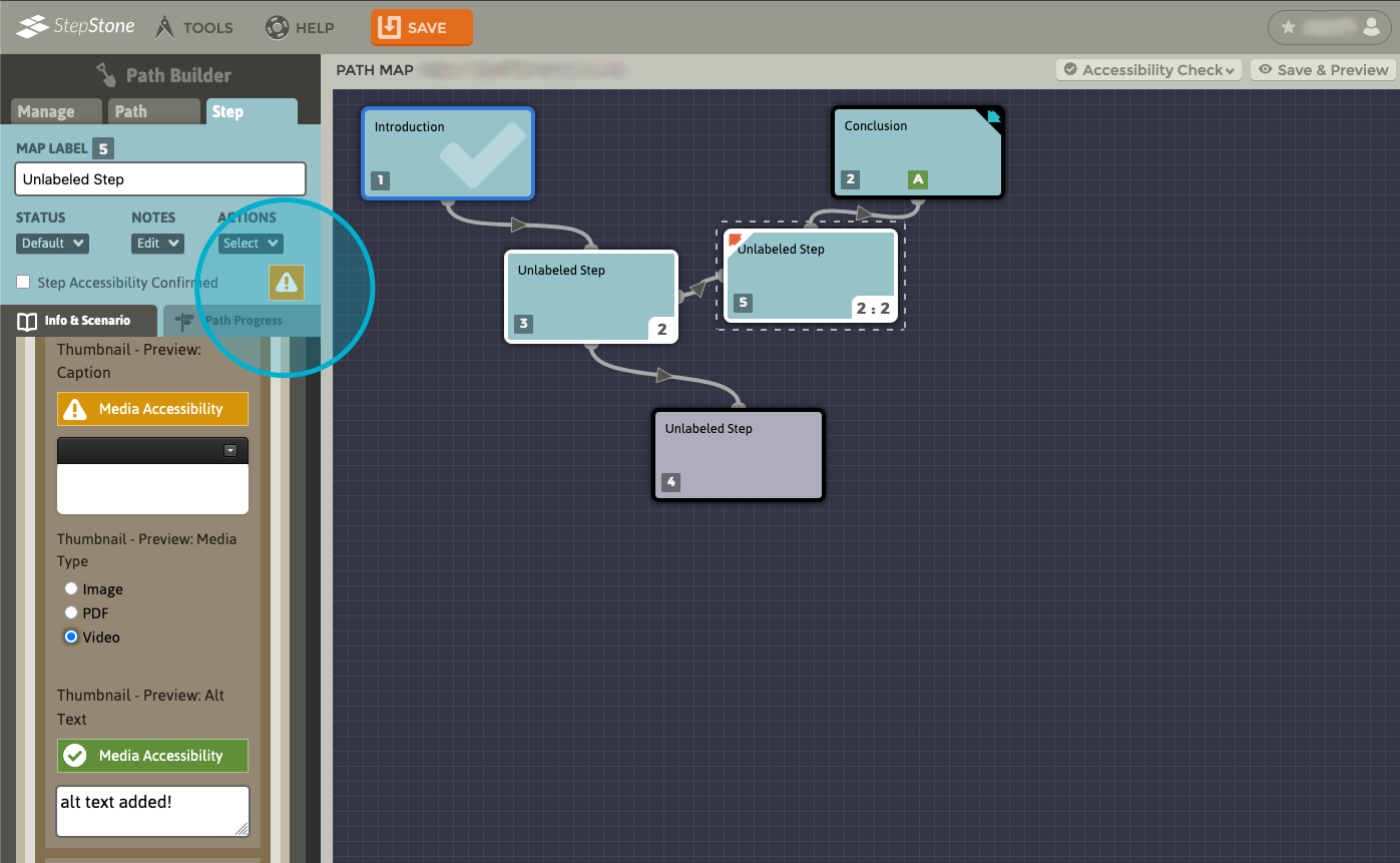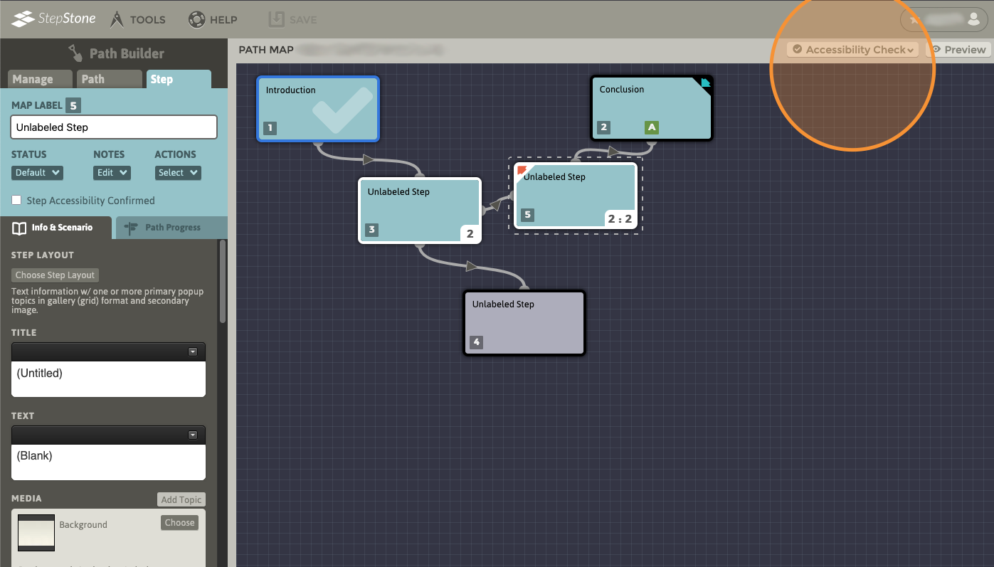 Use the Accessibility Check button in the Path Map title bar to open the Step Accessibility Scan panel.