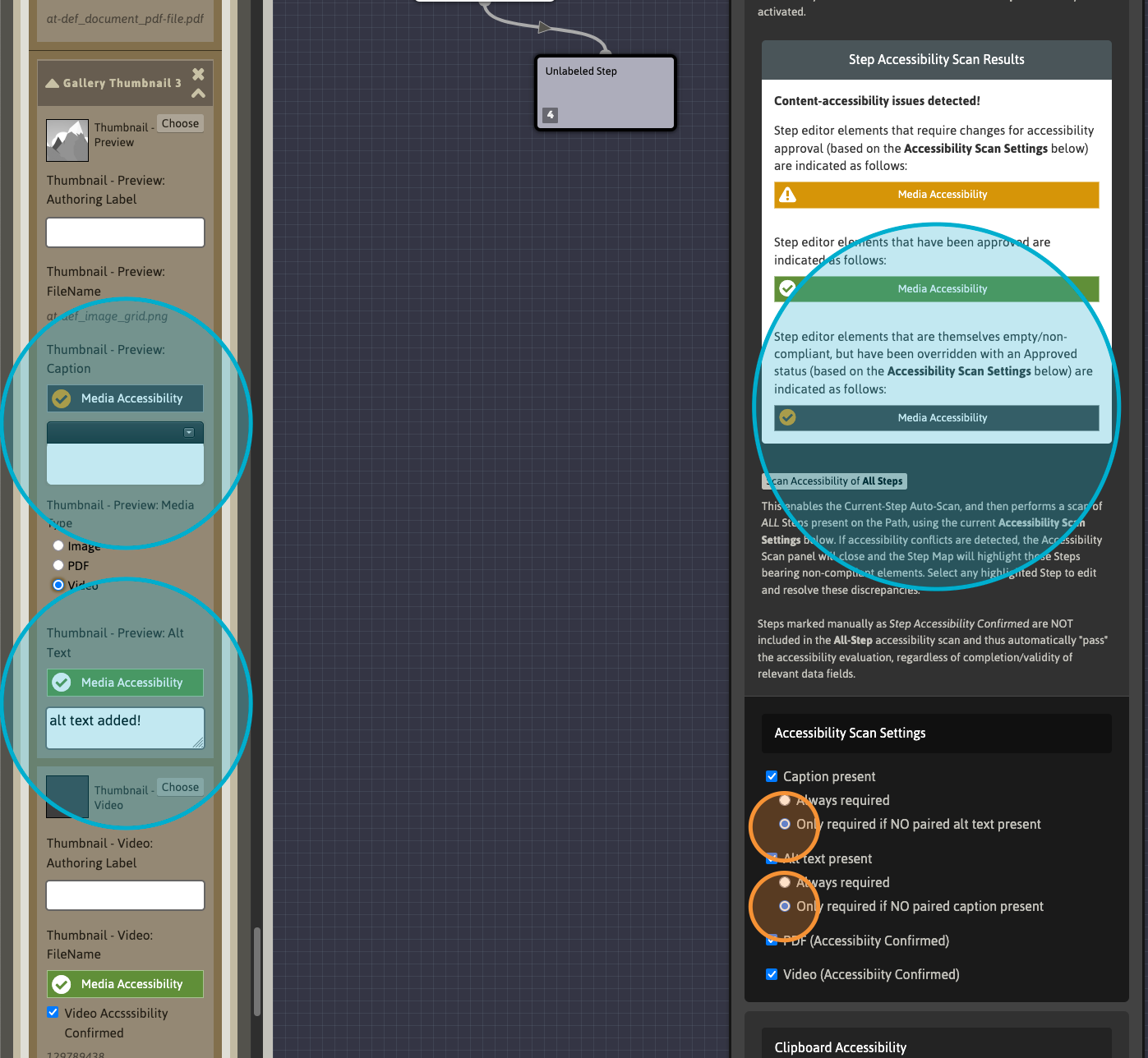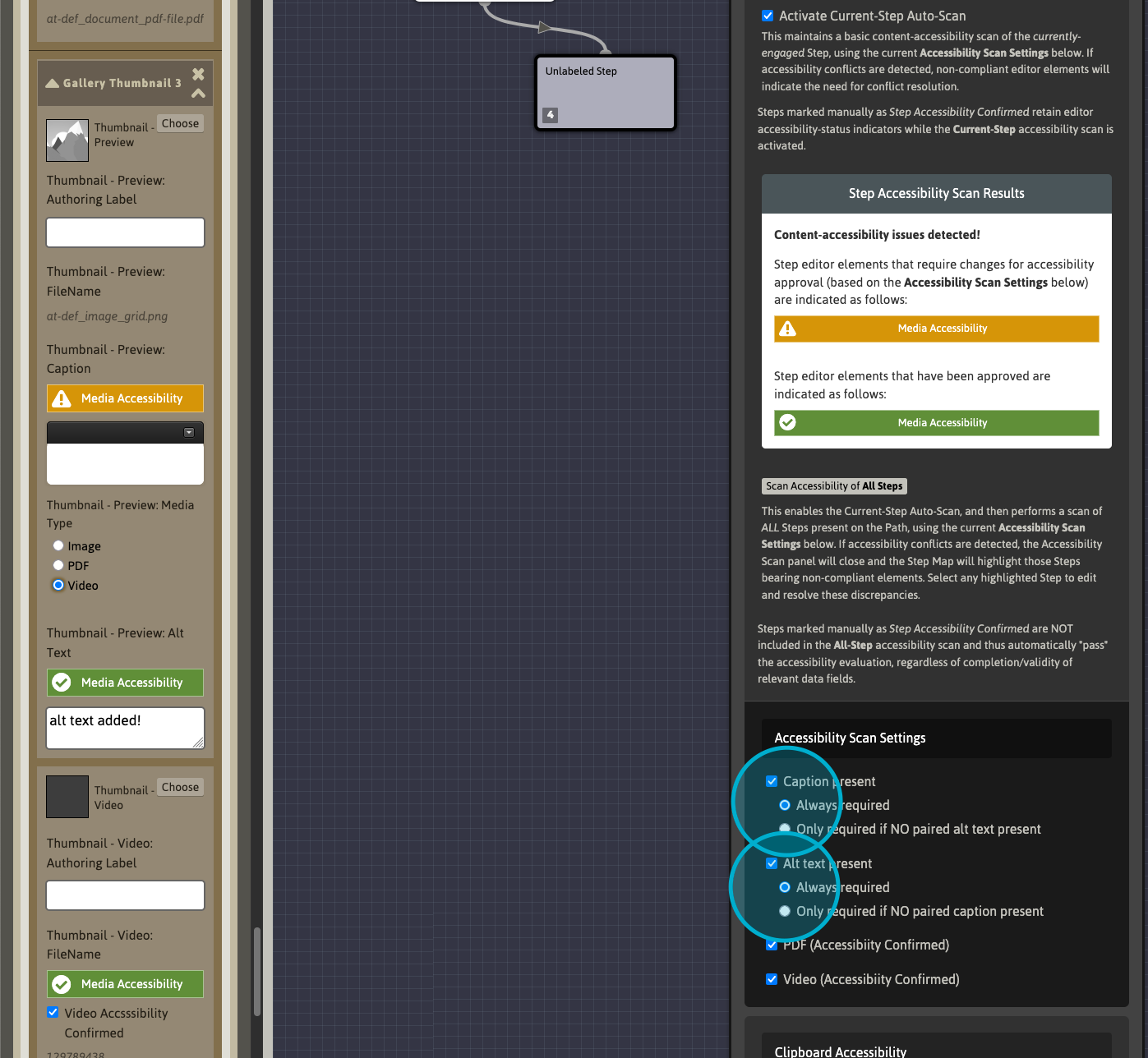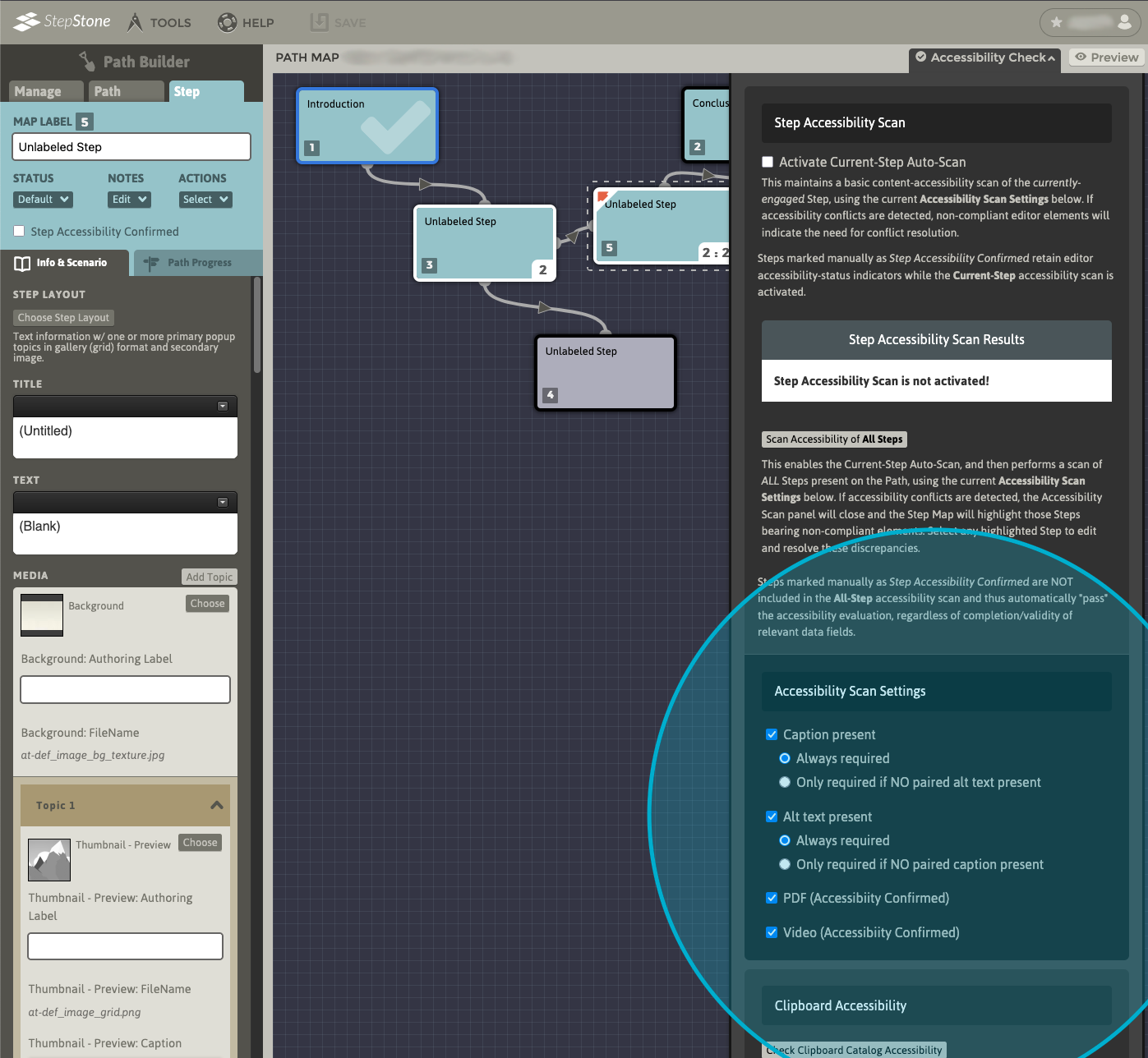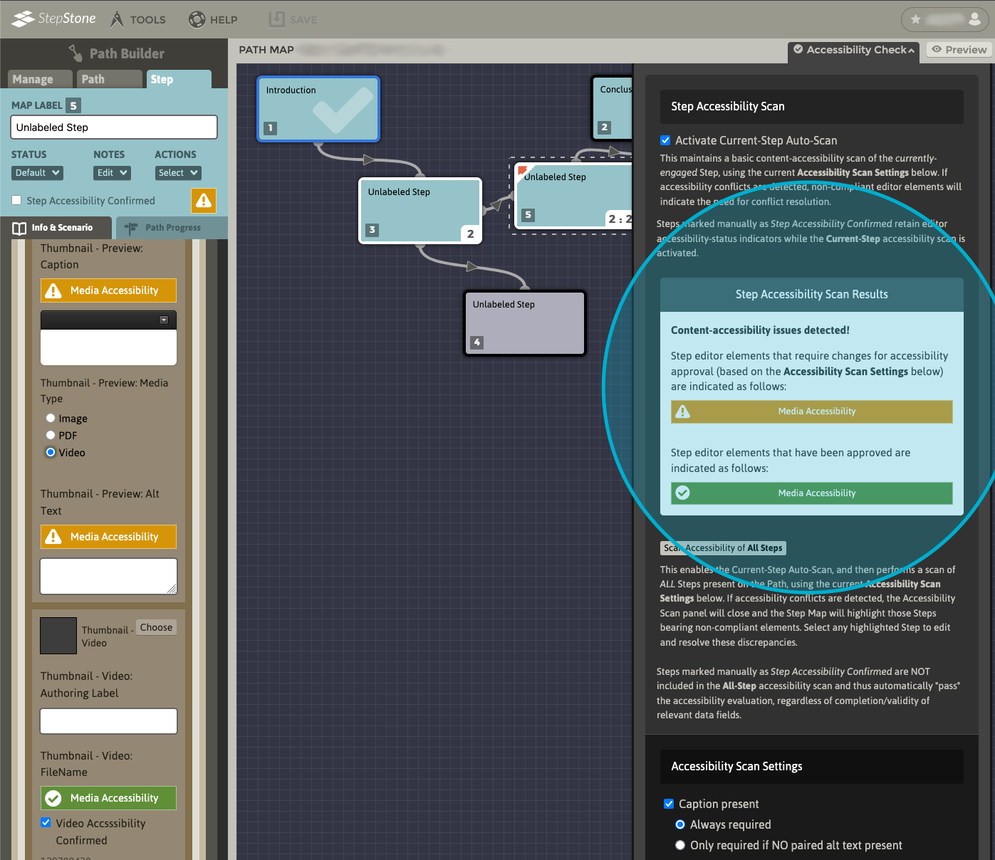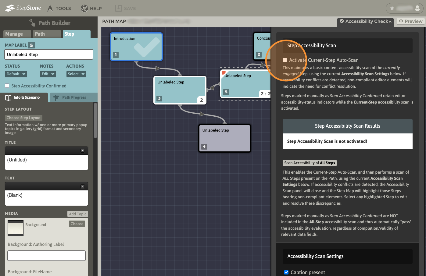 When scanning is enabled, the current Step will be assessed for certain accessibility parameters, based on the currently-selected options in the Accessibility Scan Settings panel. The scan will ONLY include, and indicate the results for, the enabled options in this panel. At least one option must be enabled to run an accessibility scan.
