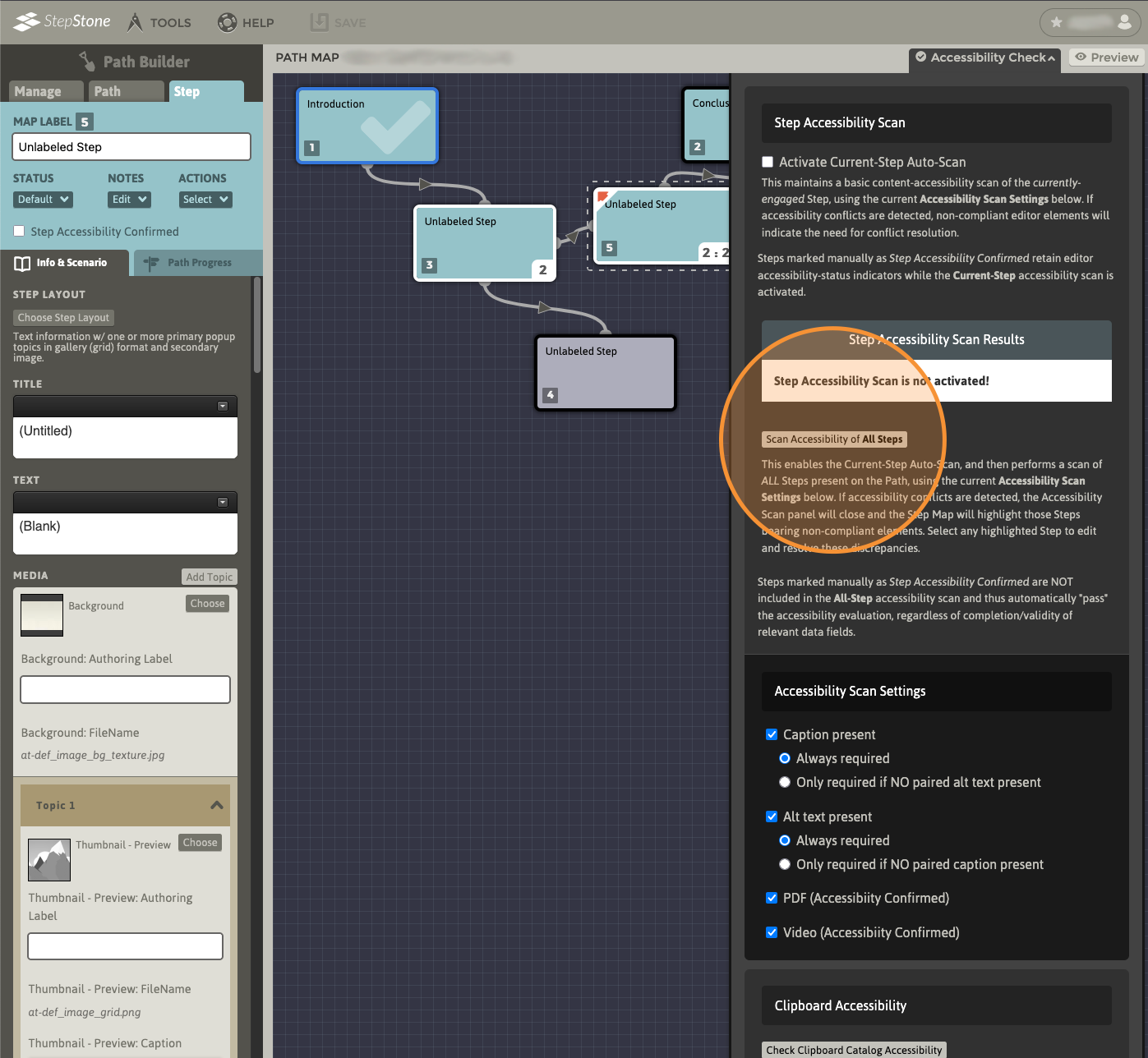 Use the Scan Accessibility of All Steps button to run an accessibility scan of the entire Path. Please refer to the information below this button in the Accessibility Check panel for more information.