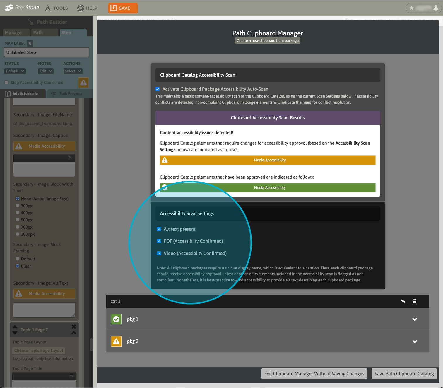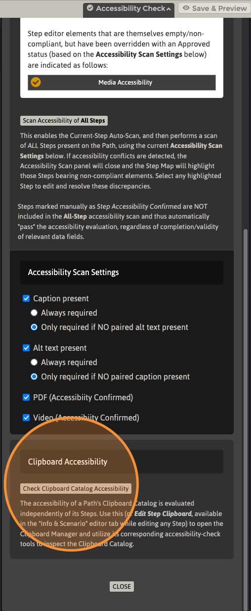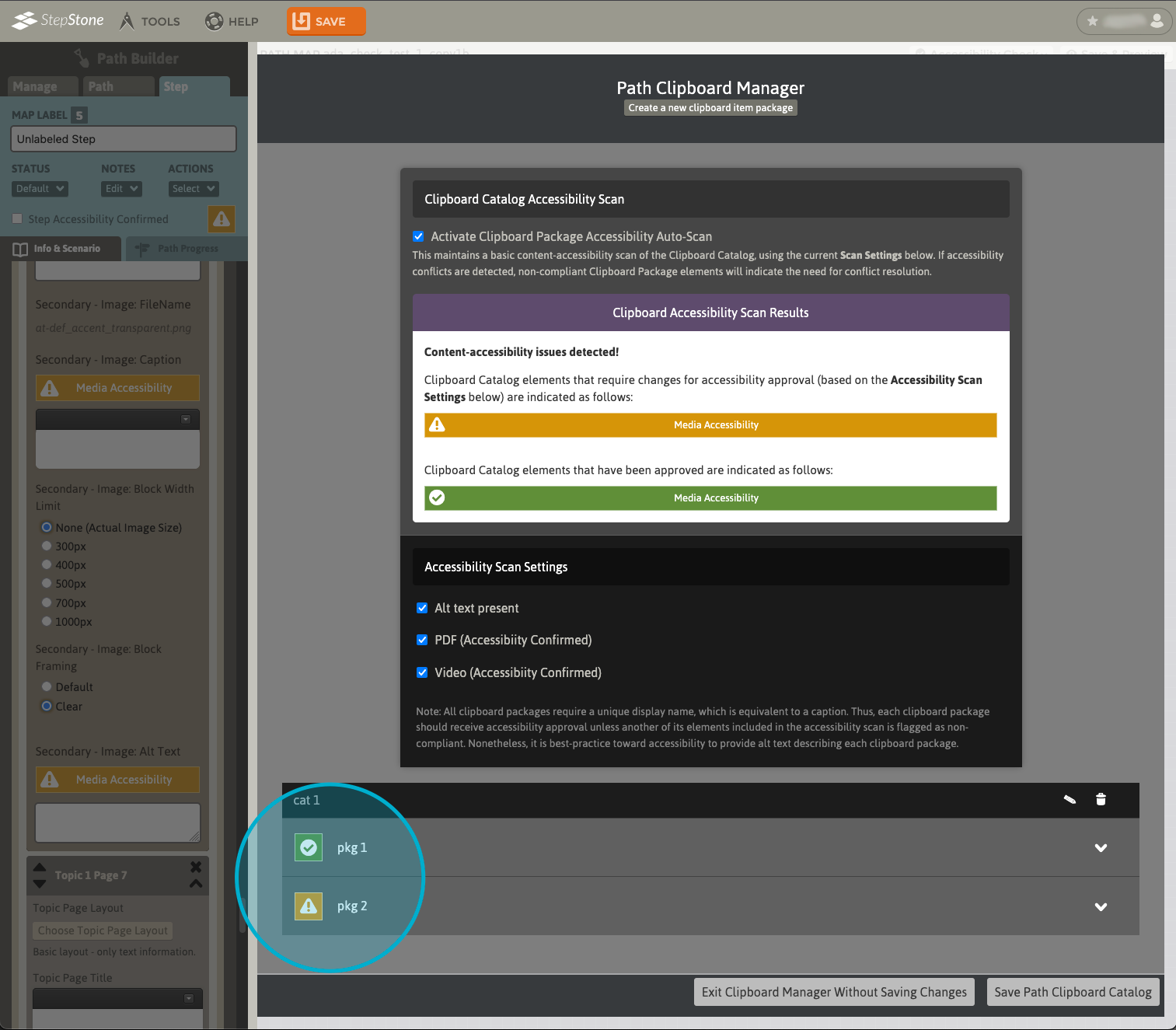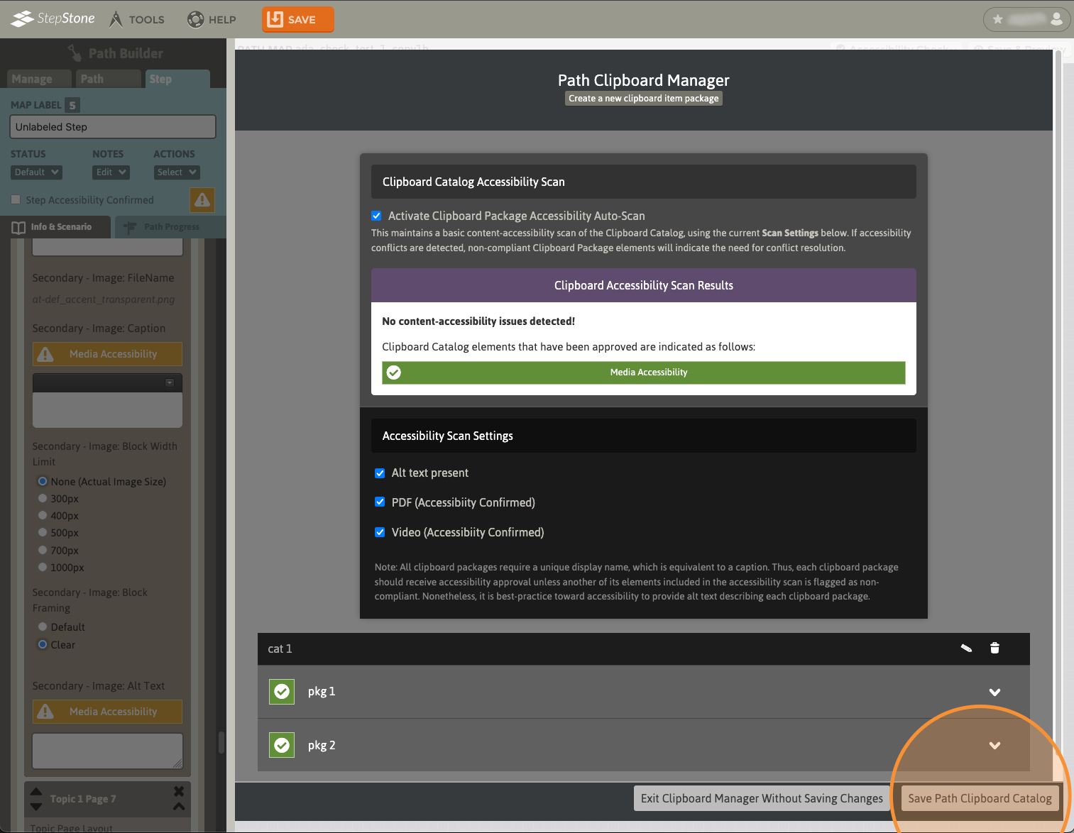 The Path Clipboard Catalog has its own accessibility-checking toolset. Use the Check Clipboard Catalog Accessibility button to open the Path Clipboard Manager directly, or use the Edit Step Clipboard button in the Info & Scenario tab while editing any Step.