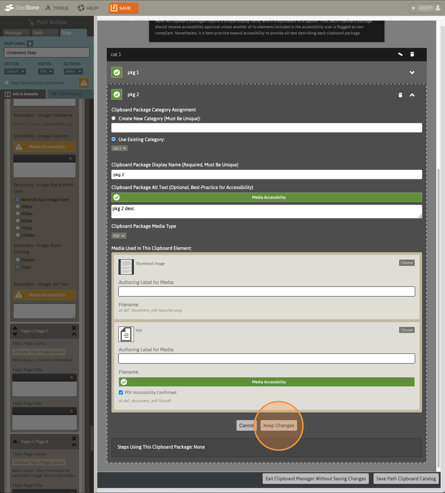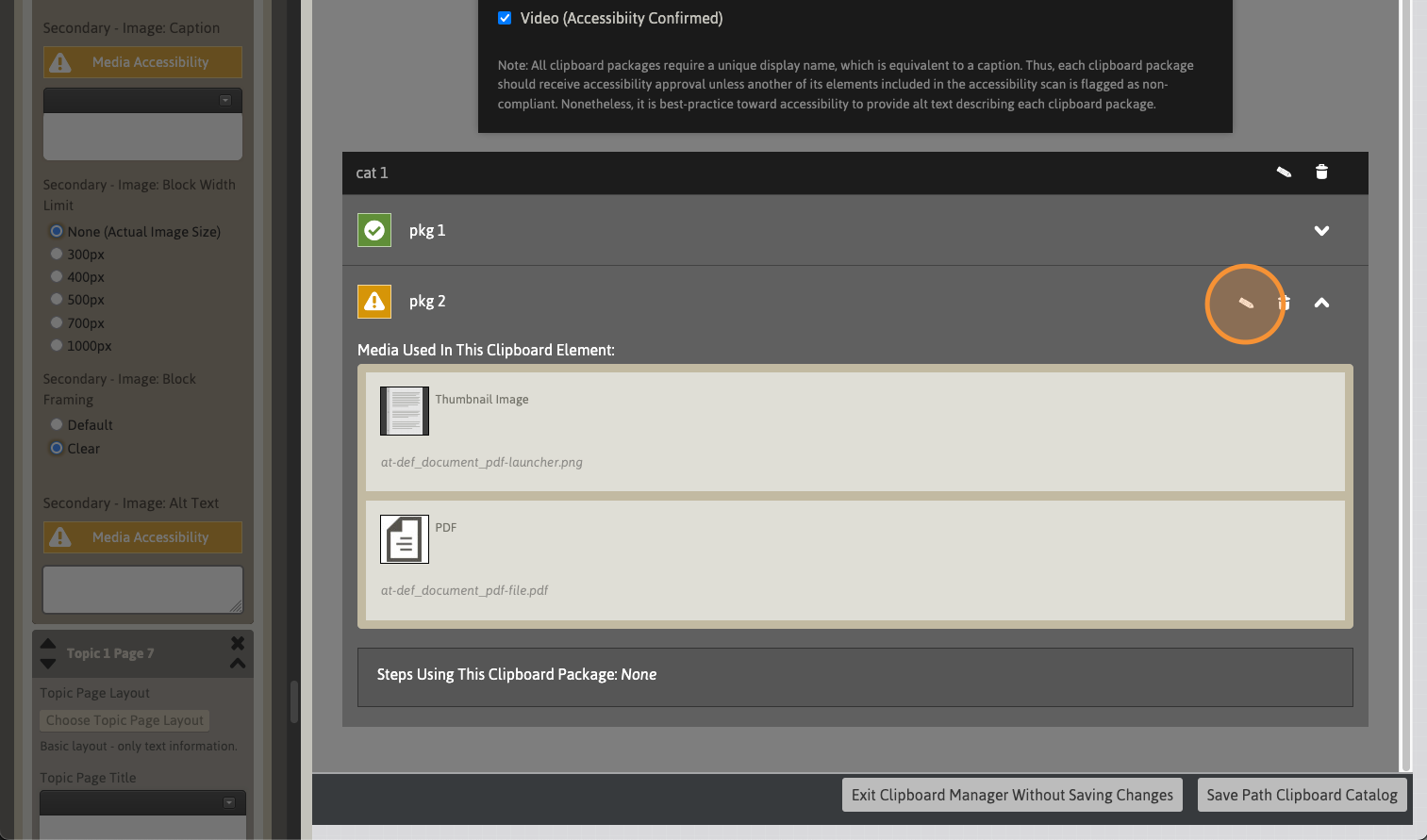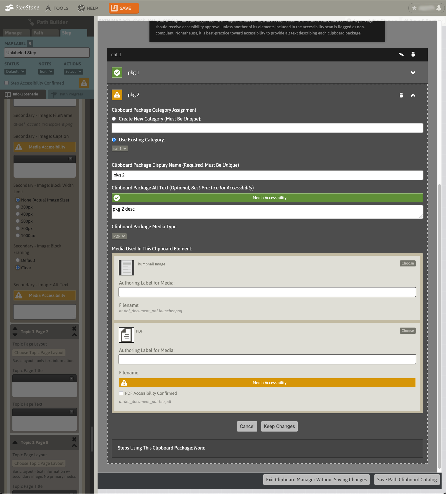 The Path Clipboard Catalog has its own accessibility-checking toolset. Use the Check Clipboard Catalog Accessibility button to open the Path Clipboard Manager directly, or use the Edit Step Clipboard button in the Info & Scenario tab while editing any Step.