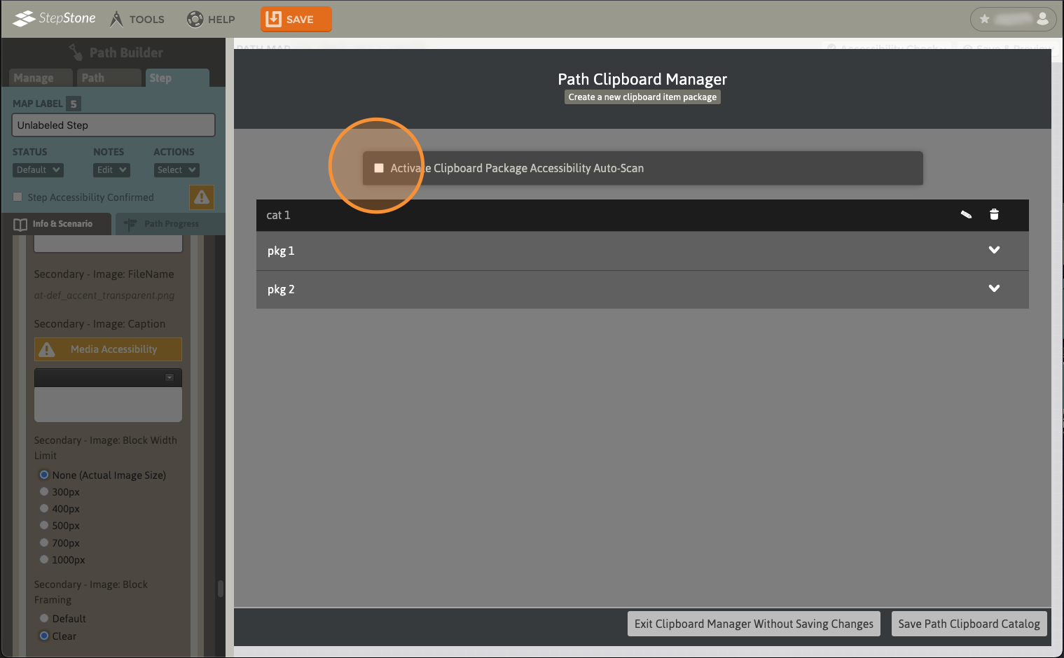 In the Path Clipboard Manager, use the Activate Clipboard Package Accessibility Auto-Scan toggle to enable auto-scan mode for the Clipboard Catalog and view the scan control panel.
